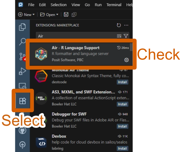Rstudio の場合は、VSCode や Positron のような拡張機能のマーケットプレイスがないため、少しだけ手間が必要です。