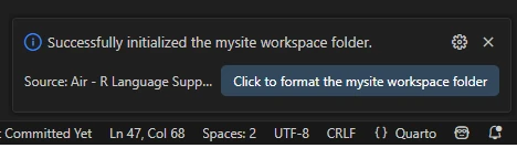powershell -ExecutionPolicy Bypass -c "irm https://github.com/posit-dev/air/releases/latest/download/air-installer.ps1 | iex"その後、再起動します。