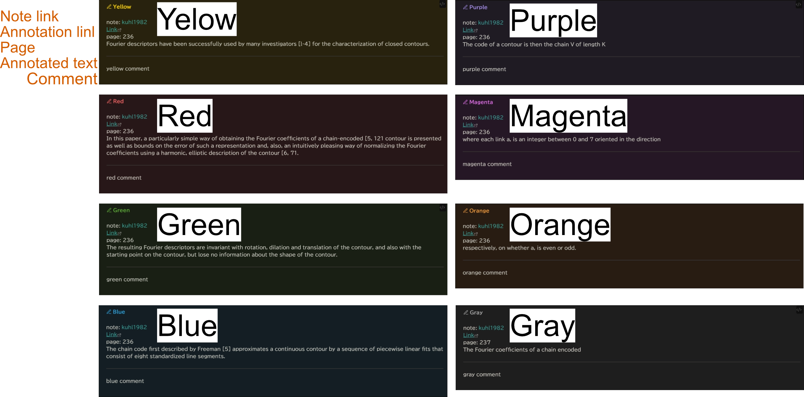 Zotero の Annotations(注釈)が表示されます。 Zotero でつけた色に対応して、注釈の色が変わります。 縦に長いので、それぞれの色の注釈と画像注釈を分けて載せます。